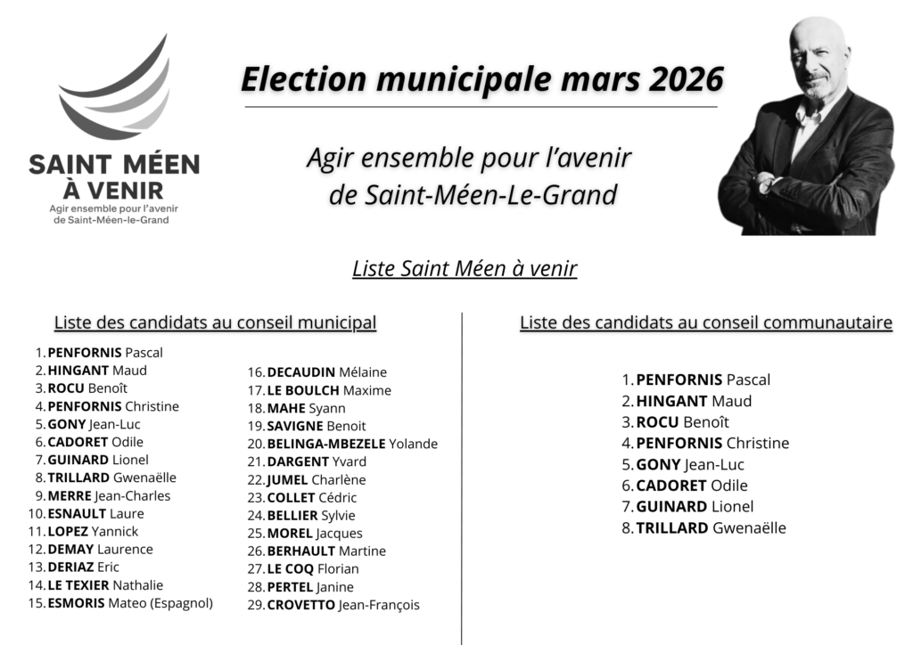 Dans le cadre des élections municipales, nous mettons à votre disposition le bulletin de vote officiel de la liste Saint-Méen à venir, afin que chacune et chacun puisse le consulter, le télécharger et l’imprimer simplement.